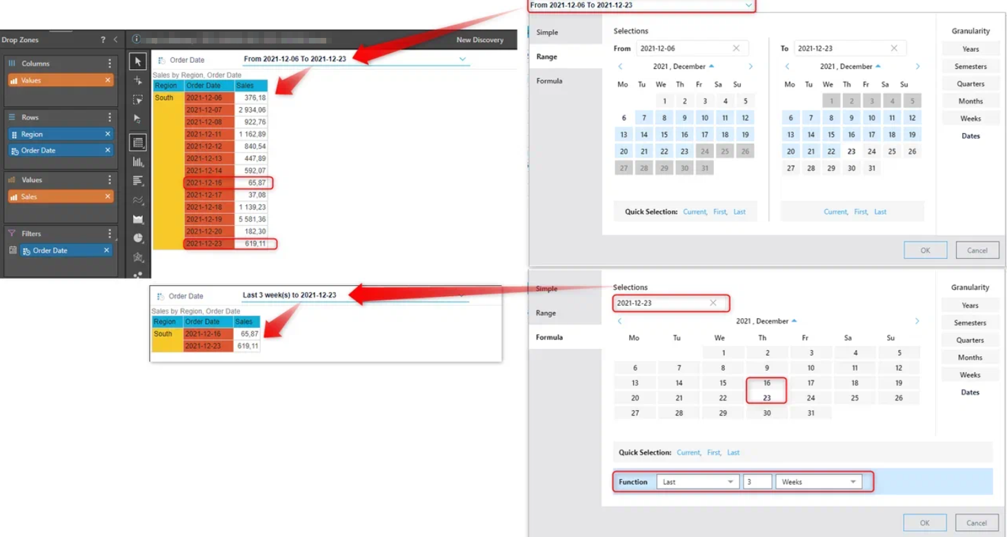 The function "Last 3 Weeks" should intuitively return all days within that 21-day period. The current behavior is completely unexpected and misleading. To get the expected result, I have to use "Last 21 Days," which is not obvious.