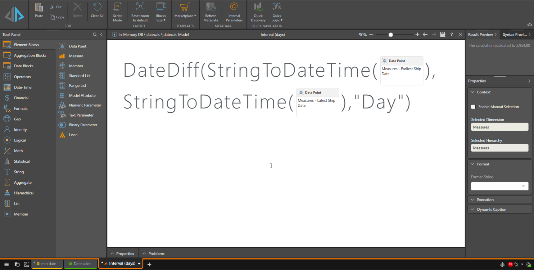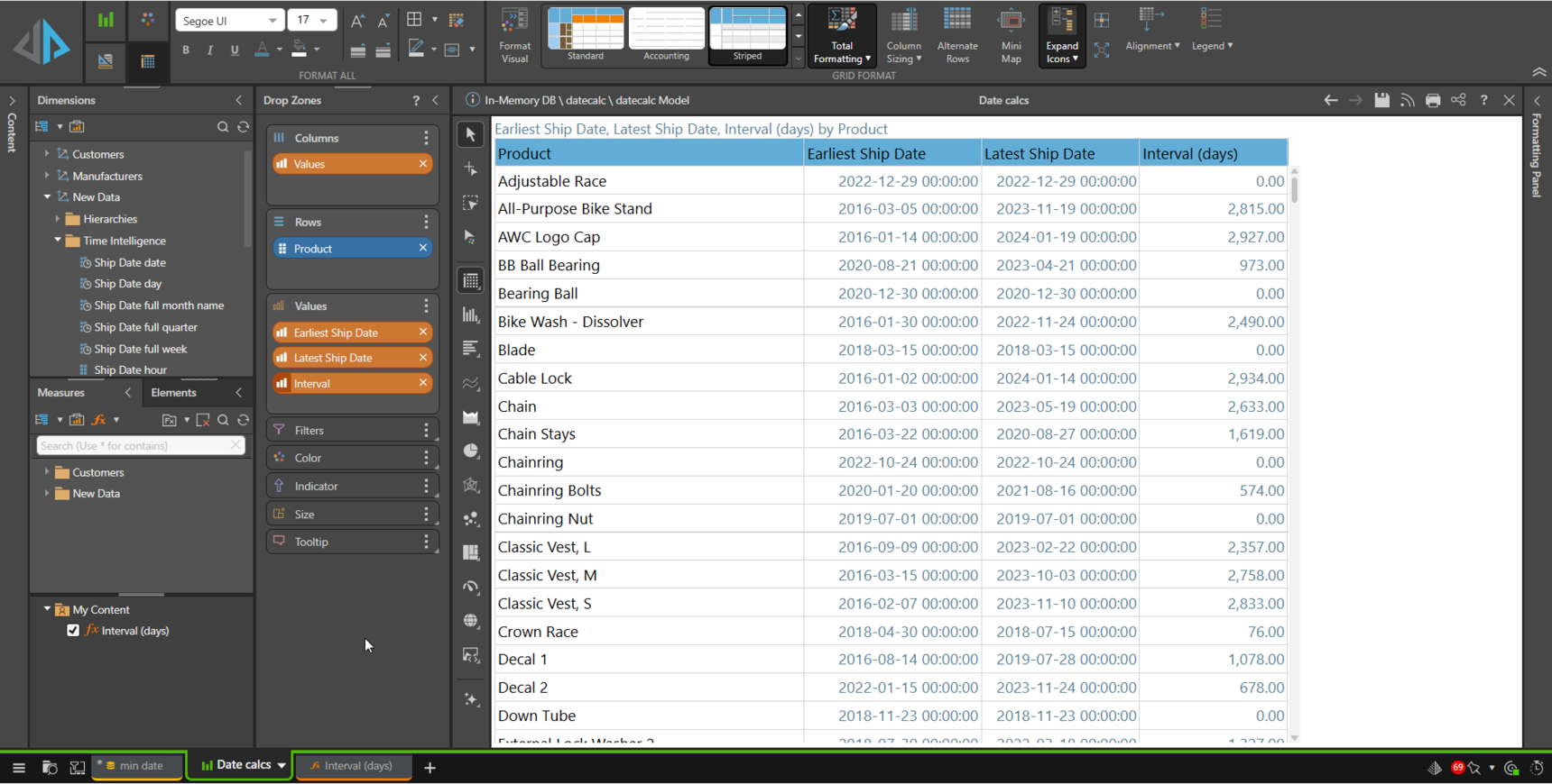 DateTime calculations can be performed on these measures, as in the interval in days between the first and last sale as above, but the Measures are just strings, they are not DateTime datatypes, so they need to be converted using StringToDateTime() before the Date functions can be applied.
