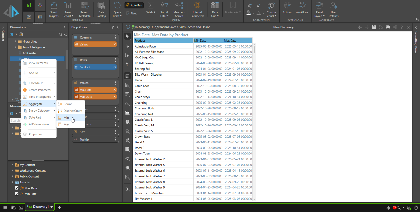 You can create these Measures directly from your Date Attribute. Right click on your Date, select Aggregate, then Min or Max. This will generate the min or max date for anything in the rows, in my case the min and max purchase date of the Product concerned. You can then go on to create further calculations as I showed previously.