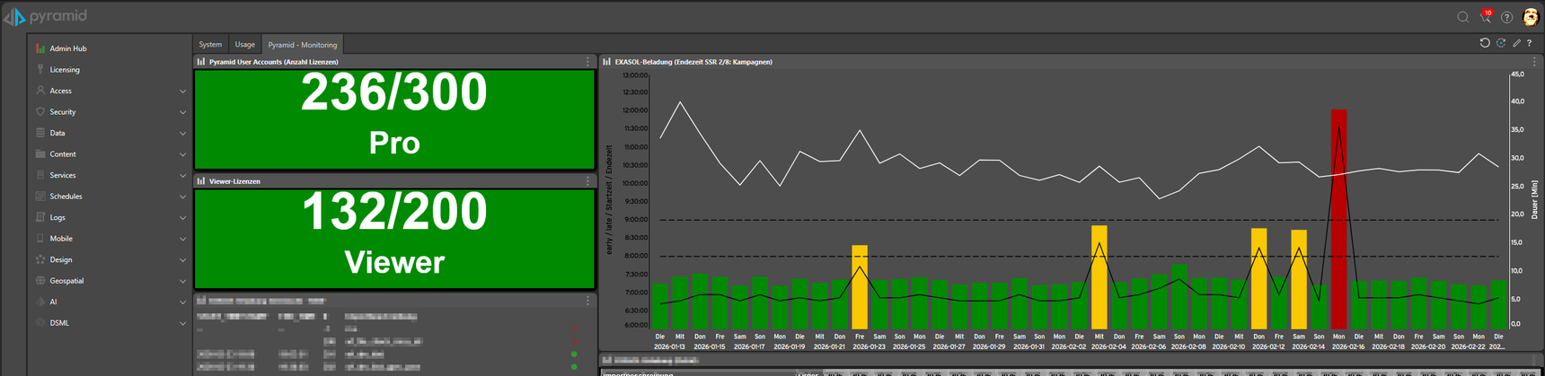 And, I don't see this directly in your example, we often use the Pyramid homepage to communicate important KPIs directly, without having to call up another artifact first. This way, the homepage itself becomes a dashboard, so to speak, by integrating Discovers there. The example below shows a type of monitoring, the current license utilization, and the history of an important nightly load run.