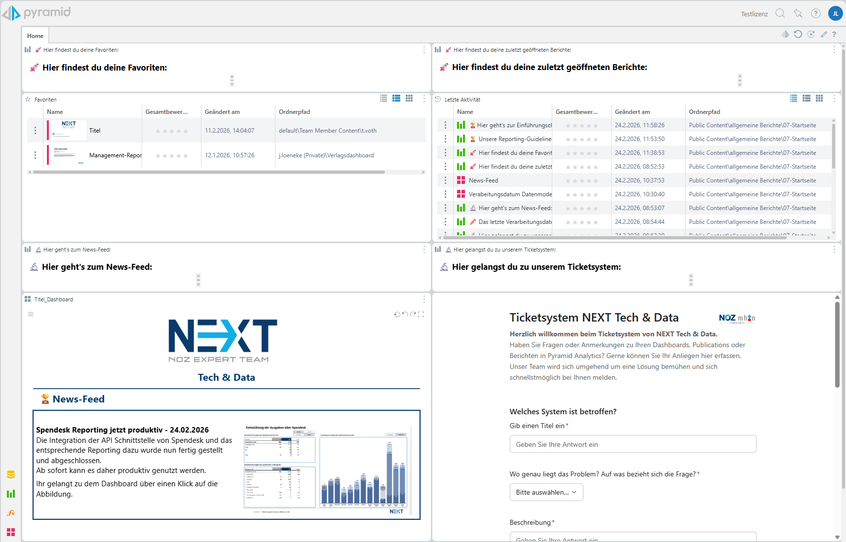 We are currently designing our own homepage in Pyramid to better tailor it to the needs of our users. The latest reports and favourites should enable them to quickly find the most important reports again. On top of that, we use the news feed to present new features, such as new dashboards or new data models. Futhermore, users can report system malfunctions to us via the ticket system.