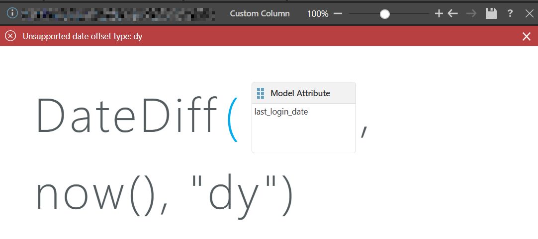 DateDiff documentation says "dy" for days, but Custom Column only accepts "dd"