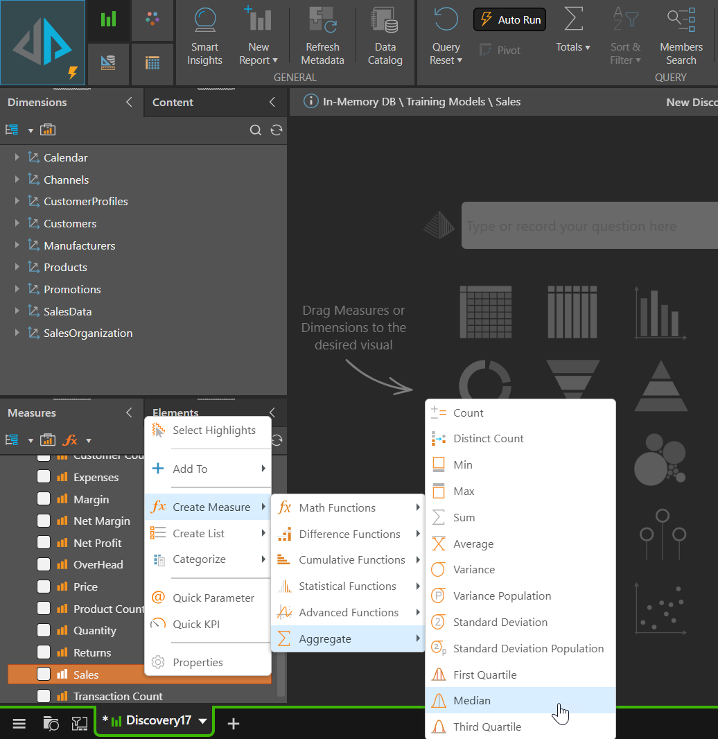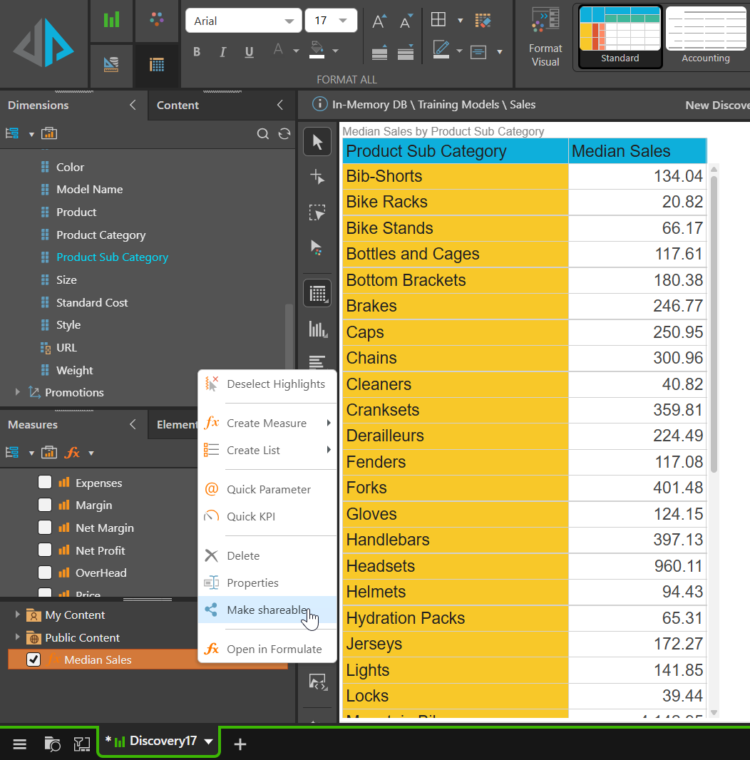 Using this quick method, the Measure will only be available for this Discover. To reuse it across other Discovers and make it available to other users, make it shareable by right clicking on Median and choose Share, to save to  a shared location accessible to others;