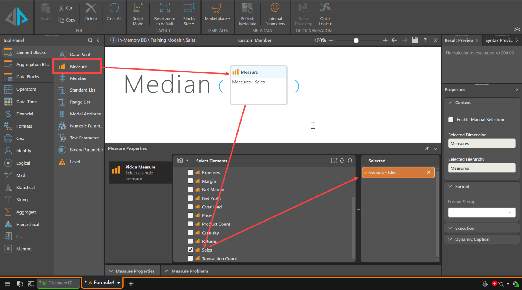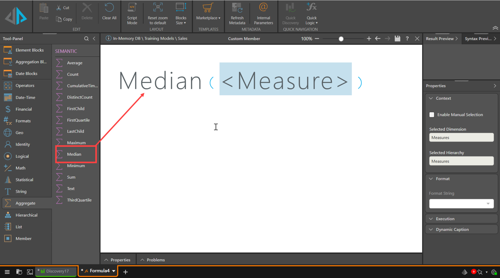 Alternatively, to create a shared Median Measure directly, create a Formulate calculation using the Aggregate Median function, using the Measure required: